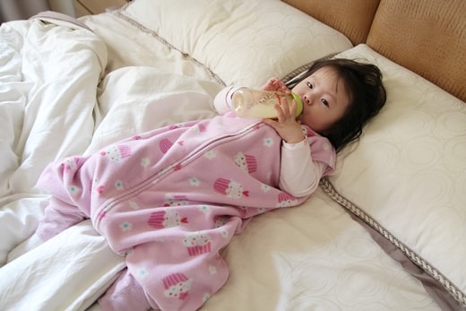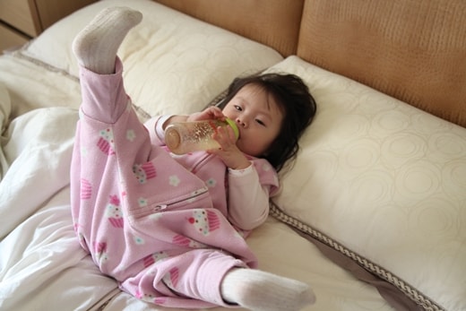 早上剛起床,我會把俏妞抱到我的大床,換好尿布,就讓她繼續穿著睡袍喝牛奶。