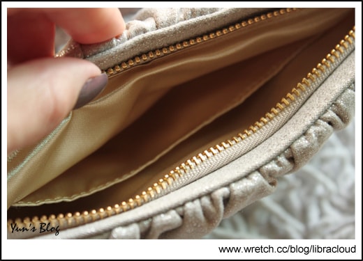 手拿包內部還有做隔層,妝眼影、腮紅、唇蜜綽綽有餘。