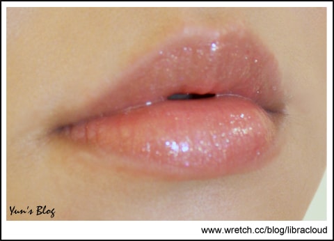 晶巧光燦唇蜜單層刷在嘴唇上,顏色是接近裸唇感覺的珊瑚橘,
