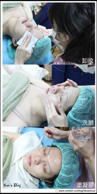先戴上手術帽、接著卸妝、塗上厚厚的凝膠,